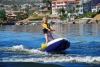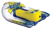 EZ Ski is a revolutionary inflatable water ski hybrid with integrated wooden water ski trainers and ski bindings. It is engineered for stability while towing (10 mph maximum), so your child will feel very secure. No more fighting with diving water skis, ski skimmers, bindings, boat wakes or ropes. Children board right from the swim step or stern of your boat, no swimming required. Children sit comfortably on the inflated seat for startups until they are ready to stand up and ski at their own pace. This awesome trainer teaches basic skiing fundamentals including proper stance, handle position, balance and weight transfer for turning. 1 Rider, 70 lbs. weight capacity. 47"L x 35"W x 12"H inflated.
