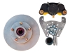 Integral vented GalvX coated 9.6" one piece 5 lug hub rotor assembled with seal, bearings and grease. Aluminum calipers have stainless steel/aluminum pistons and use ceramic pads with stainless steel backing plates. Caliper mounting bracket and stainless steel slider pins included. fit most 13" and larger wheels. Brake for one wheel. Two kits required per axle.